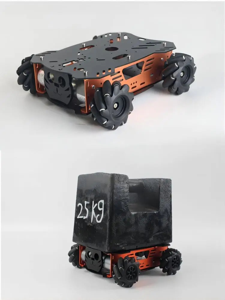 For maximum load performance (up to 25kg), choose the 1:90 encoder motor version and use a 12V lithium battery.